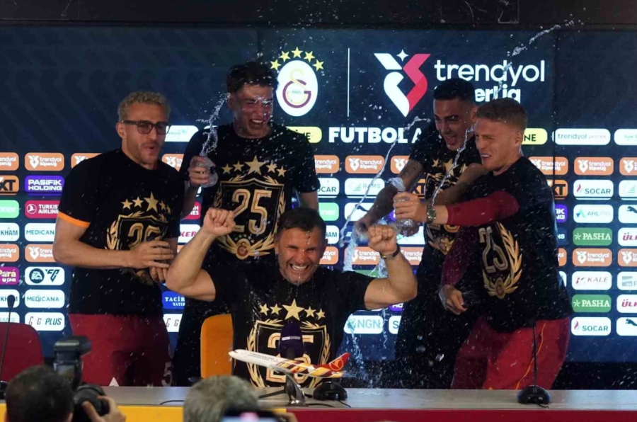 Galatasaraylı futbolculardan Okan Buruk’a basın toplantısında sulu sürpriz